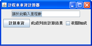 import java.awt.Container; import java.awt.event.ActionEvent; import java.awt.event.ActionListener; import javax.swing.JButton; import javax.swing.JCheckBox; import javax.swing.JFrame; import javax.swing.JLabel; import javax.swing.JPanel; import javax.swing.JTextField; @SuppressWarnings("serial") public class a11967046 extends JFrame implements ActionListener{ /* s11967046 公版 * 請設計一個Swing應用程式來計算計程車的車資。 * 1. JTextField可以輸入里程數。 * 2. JCheckBox元件勾選是否夜間加成(夜間加成20%)。 * 3. 按下JButton元件可以計算車資 * 且在一JLabel元件顯示 里程數在1500公尺內是80元 * 每多跑500公尺加5元,如果不足500公尺以500公尺價錢計算 * 夜間加成20%。 */ JPanel panel = new JPanel(); //新增一個Panel容器 JCheckBox night_box = new JCheckBox(); //新增「夜間加成」選項 JButton count_btn = new JButton(); //新增「計算」的按鈕 JLabel label = new JLabel(); //新增顯示結果文字標籤 JTextField field = new JTextField(20); //新增一個文字框 public a11967046(){ //設定應用程式的標題 super("計程車車資計算器"); //取得視窗容器 Container c = this.getContentPane(); //設定文字框內訊息 field.setText("請於此輸入里程數"); //全選文字框,方便使用者更改 field.selectAll(); //設定按鈕文字 count_btn.setText("計算車資"); //設定文字標籤提示訊息 label.setText("此處列出計算結果"); //設定CheckBox文字 night_box.setText("夜間加成"); //將物件加入Panel中 panel.add(field); panel.add(count_btn); panel.add(label); panel.add(night_box); //將Panel加入Container中 c.add(panel); //建立按鈕的監聽事件,呼叫自己這個的類別,去實作ActionListener //和一個actionPerformed方法 count_btn.addActionListener(this); } public static void main(String[] args) { a11967046 frame = new a11967046(); //設定frame的關閉事件為DISPOSE_ON_CLOSE: //將本視窗的系統資源釋放掉,等到所有視窗都被Dispose時, //則關閉應用程式 frame.setDefaultCloseOperation(DISPOSE_ON_CLOSE); //設定frame的Size frame.setSize(300,150); //設定frame為可見 frame.setVisible(true); } @Override public void actionPerformed(ActionEvent event) { double sum = 0; //乘客需要付款的總額 int count = 0; //當里程數不足500時,用來計算的變數 //取得里程數 int mile = Integer.parseInt(field.getText()); //當「夜間加成」的按鈕被選取時,所有的總價需乘以20% if (night_box.isSelected()){ //假設里程數低於1500 if(mile <= 1500){ sum = 80 * 1.2; label.setText("乘客需付" + sum + "元"); } //假設里程數可以被整除 else if(mile%500 != 0){ //使用For迴圈計算里程數的價錢 //先扣除1500後,再計算可以被500除幾次 //類似整數除法 for (int i = mile-1500 ; i>=0; i-=500){ count++; } sum = (80 + count*5)*1.2; label.setText("乘客需付" + sum + "元"); } //當里程數大於1500且又不能被500整除 //會落入這個階段,這時直接將里程數扣掉1500 //並且除以500得出的數字乘以5元即可 else{ sum = (80 + (mile-1500)/500*5)*1.2; label.setText("乘客需付" + sum + "元"); } } //以下類同,僅差20%加成 else{ if(mile <= 1500){ sum = 80; label.setText("乘客需付" + sum + "元"); } else if(mile%500 != 0){ for (int i = mile-1500 ; i>=0; i-=500){ count++; } sum = 80 + count*5; label.setText("乘客需付" + sum + "元"); } else{ sum = (80 + (mile-1500)/500*5); label.setText("乘客需付" + sum + "元"); } } } }